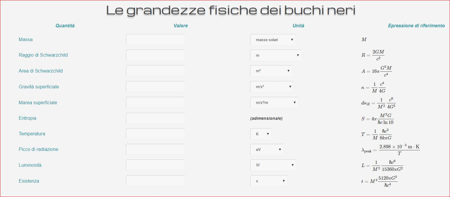 [fancybox url=”https://ilpoliedrico.com/le-grandezze-fisiche-dei-buchi-neri” ][/fancybox]Cliccando sull’immagine qui sopra vi si aprirà una finestra su cui potete sbizzarrirvi a studiare alcune delle bizzarre proprietà matematiche dei buchi neri.